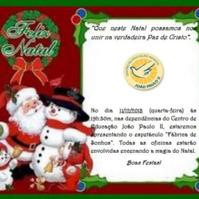 No dia 11 de dezembro, às 19h30, as crianças do Centro de Educação João Paulo II (CEJPII) vão apresentar o tradicional espetáculo de Natal, que este ano terá como tema: Fábrica dos Sonhos. As canções da peça também serão apresentadas...