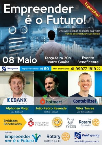 No dia 08 de maio será realizado o evento “Empreendedorismo, inovação e o segredo de negócios de sucesso” no teatro Guaíra, às 20h. Os três assuntos estarão reunidos num dos maiores eventos sobre startups e negócios disruptivos, realizado nos últimos tempos em Curitiba.