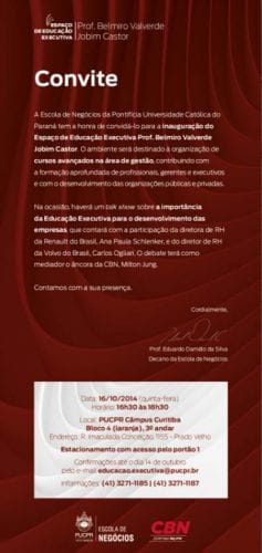 A Escola de Negócios da PUCPR inaugura o Espaço Educação Executiva Professor Belmiro Valverde Jobim Castor no dia 16 de outubro, às 16h. O objetivo do espaço é oferecer cursos de curta duração destinados a determinados segmentos. São voltados para profissionais com cargos de gestão e executivos, que, em muitos casos, já passaram por um curso de pós-graduação Lato Sensu, seja especialização ou MBA, caracterizados por serem mais longos e generalistas.